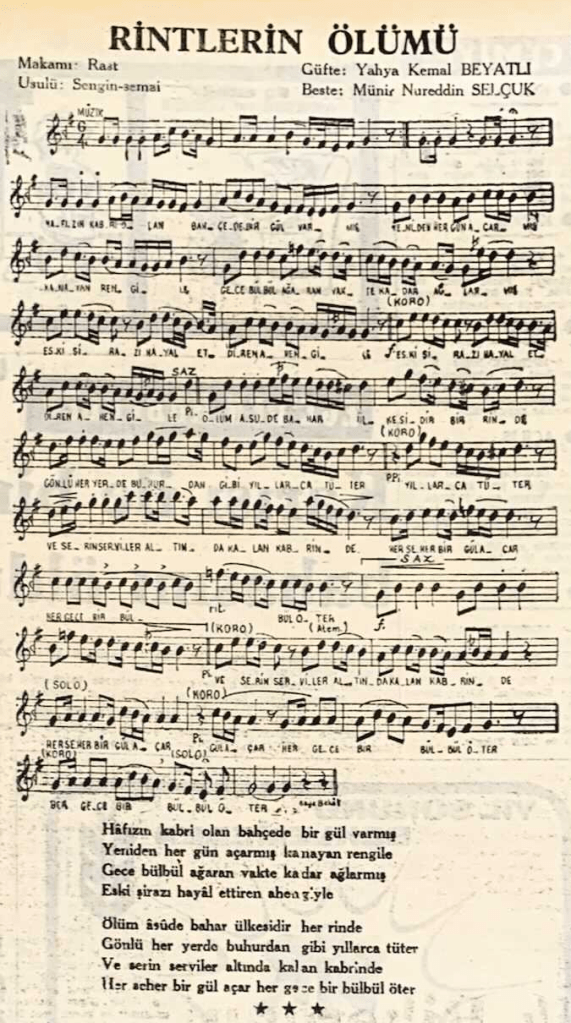 Bu devirde yaşayan ihtiyar orta yaşlı ve genç vatandaşlar eski musikimizin bestelerini Münir Nureddin‘den dinledikleri için talihlidirler.